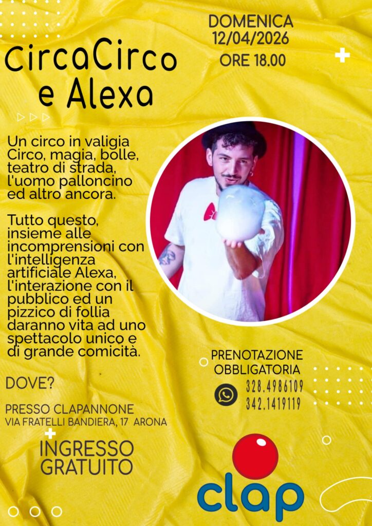 Domenica 12 aprile 2026 alle ore 18:00 arriva al Clapannone uno spettacolo imperdibile per tutta la famiglia: “CircaCirco e Alexa“, uno spettacolo di circo per famiglie ad Arona capace di unire magia, comicità e tecnologia in modo originale e sorprendente.