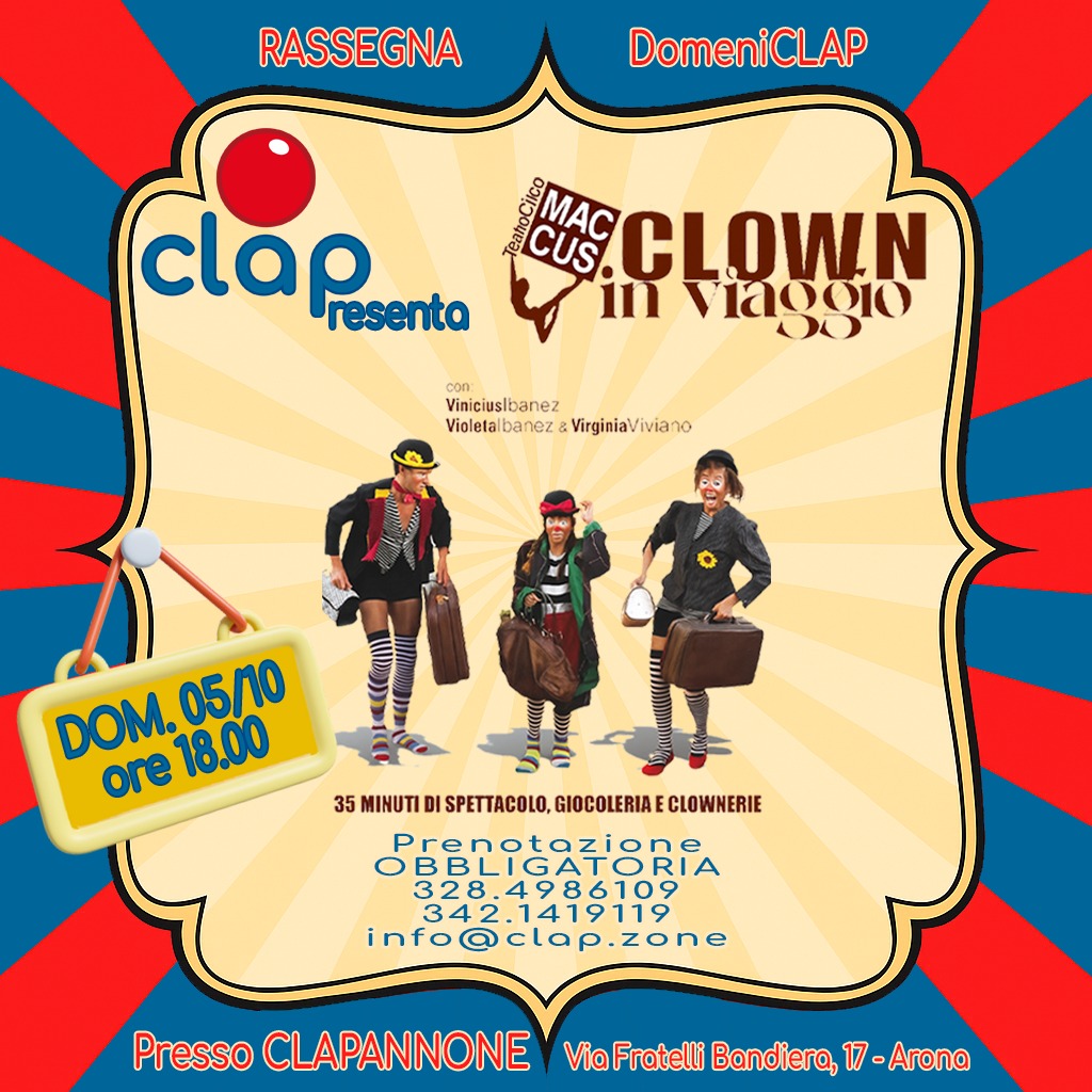La rassegna DomeniCLAP torna ad Arona con la sua terza edizione. Il primo appuntamento è con lo spettacolo Clown in viaggio Arona, messo in scena dal Teatro Circo Maccus. Un inizio che promette comicità, poesia e tanta magia.